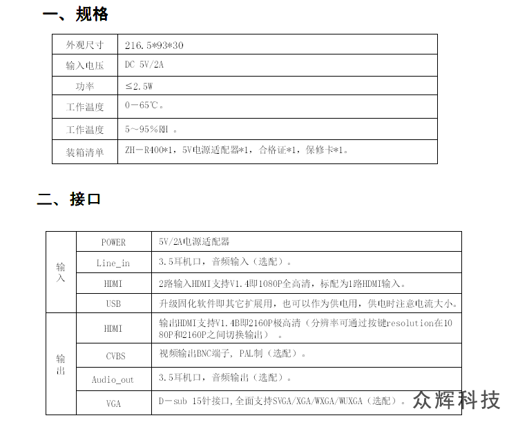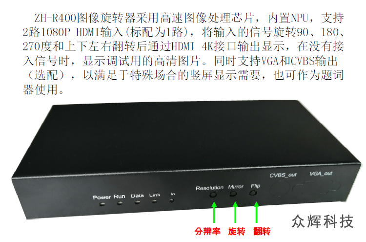 此款為ZH-R100的升級(jí)高端版本ZH-R400,此版本為全新發(fā)售,Linux嵌入式系統(tǒng),支持NPU,全按鍵操作,自動(dòng)記憶,自帶測試底圖,沒有信號(hào)接入時(shí)也可以調(diào)試,輸出分辨率可以設(shè)置為1080P和2160P。支持上下左右鏡像,可做為題詞器使用。彌補(bǔ)之前版本分辨率低,顯示文字不清楚的問題,如果對(duì)顯示要求不高,價(jià)絡(luò)敏感的用戶也可以選擇ZH-R100 如果有更高要求,也可以選擇ZH-R500,4K輸入和4K輸出版本,如果喜歡安卓系統(tǒng)可以選擇ZH-R300。